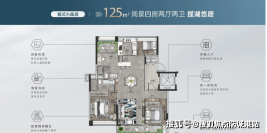 小高层125㎡四房户型:作为绝版南向板式四房,该户型是改善型家庭的热门选择。户型南北通透,通风采光俱佳,客厅与餐厅相连,形成开阔的公共活动区域,适合家庭聚会、亲友宴请。主卧套间配备大尺寸飘窗,采光充足且视野开阔,独立卫生间干湿分离;其余三个卧室空间方正,布局合理,可满足老人同住、儿童成长或书房需求。阳台采用全景设计,连接客厅与次卧,最大化享受湖山景观与社区绿化。