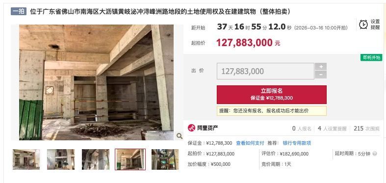 据阿里拍卖,位于广东省佛山市南海区大沥镇黄岐泌冲浔峰洲路地段的土地使用权及在建建筑物将于3月16日开拍,起拍价约1.28亿元。