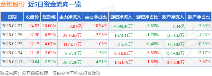 2月27日的资金流向数据方面,主力资金净流入2.01亿元,占总成交额10.94%,游资资金净流出6690.46万元,占总成交额3.63%,散户资金净流出1.34亿元,占总成交额7.3%。