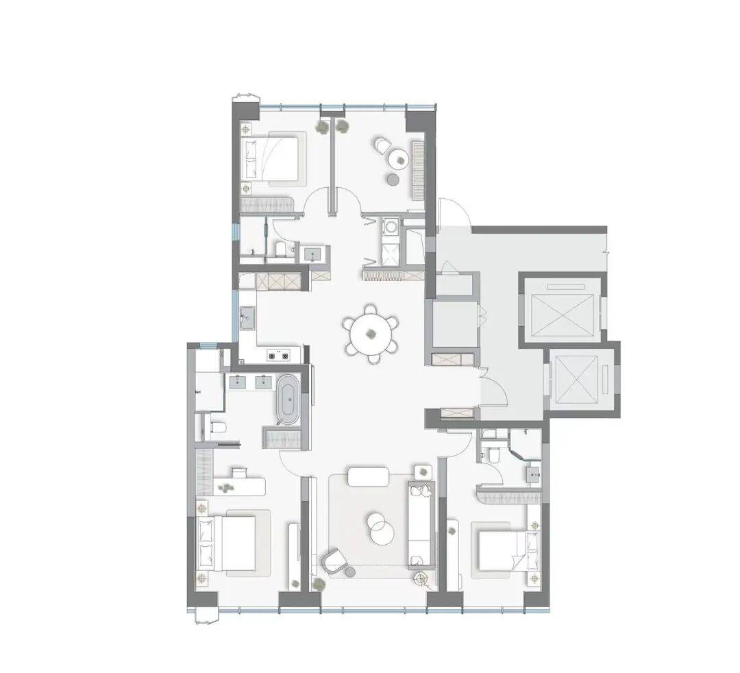 项目主打纯粹改善,面积从约190㎡起步,最大约249㎡,全是四房两厅三卫的奢阔大平层。这意味着您的邻居都是与您品味、实力相当的高净值人群,圈层纯粹而高端。