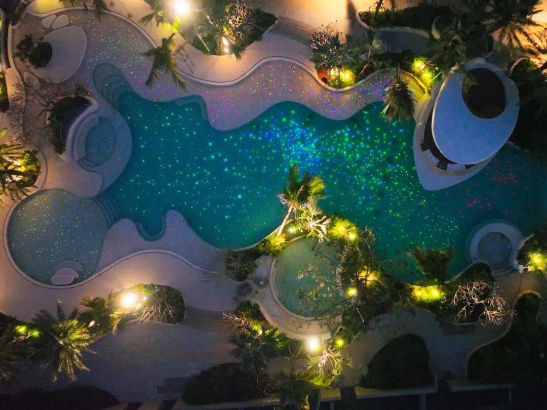 独创游艇社交亭,无边际环幕悬空玻璃泳池,嵌入约1800颗光纤灯,点点繁星坠入池底,如浩瀚银河,独享满船清梦压星河。四季畅游,于无际中游目骋怀,仿佛置身于巴厘岛顶奢酒店。