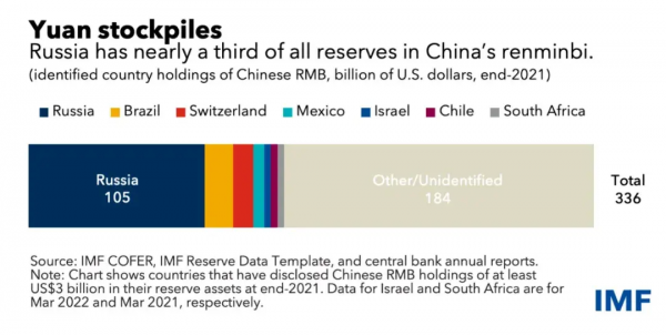另外,因为SWIFT是美元货币为核心的,所以,俄罗斯就进一步实施去美元化策略,如增加黄金储备,进一步增加人民币等友好国家的货币作为储备货币。
