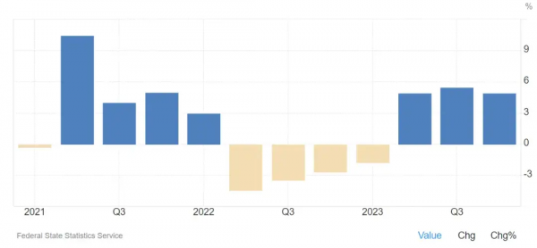 俄罗斯自身也陷入高通胀问题中,不过俄罗斯央行、财政部等通过各种无限量逆回购、放宽波动管制、财政直接性补助的手段,慢慢稳住了国内经济,到2023年俄罗斯GDP重回正增长(考虑到前一年低基数效应),其中俄罗斯对外的能源商品贸易居功至伟。