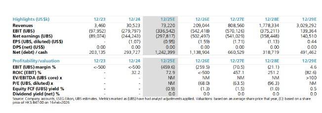 近日,比摩根大通更积极的瑞银,对Minimax 给出了1000港元目标价。据瑞银称,这是基于 125 倍 P/ARR(价格/年度经常性收入),应用于 2026年12月3.18亿美元ARR所测算得到的值(见下表),并使用 SOTP交叉验证了这个目标价。